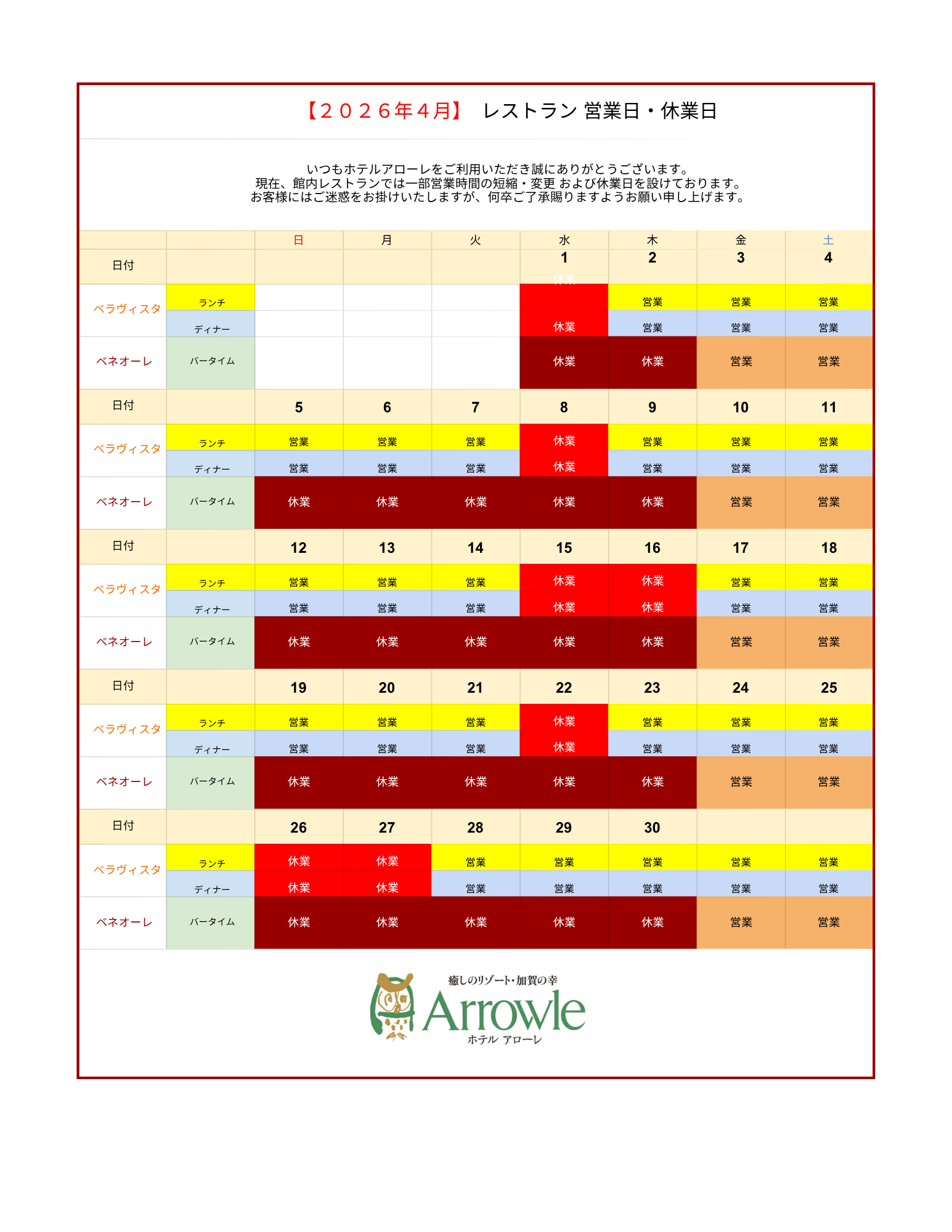 平素よりホテルアローレをご愛顧いただき、誠にありがとうございます。