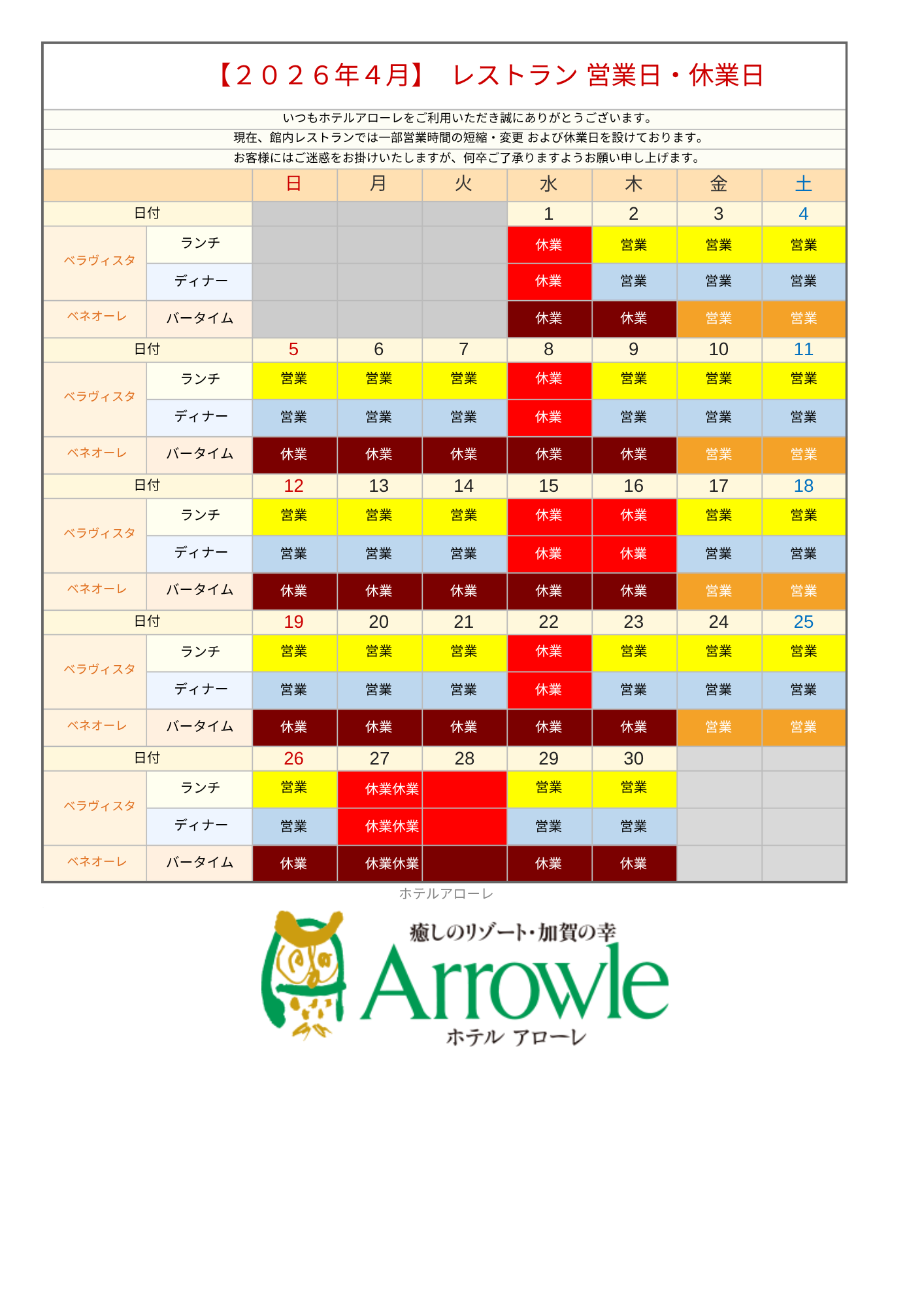 いつもホテルアローレをご愛顧いただき、心より感謝申し上げます。現在、館内レストランにおきまして、一部営業時間の変更および休業日を設けさせていただいております。