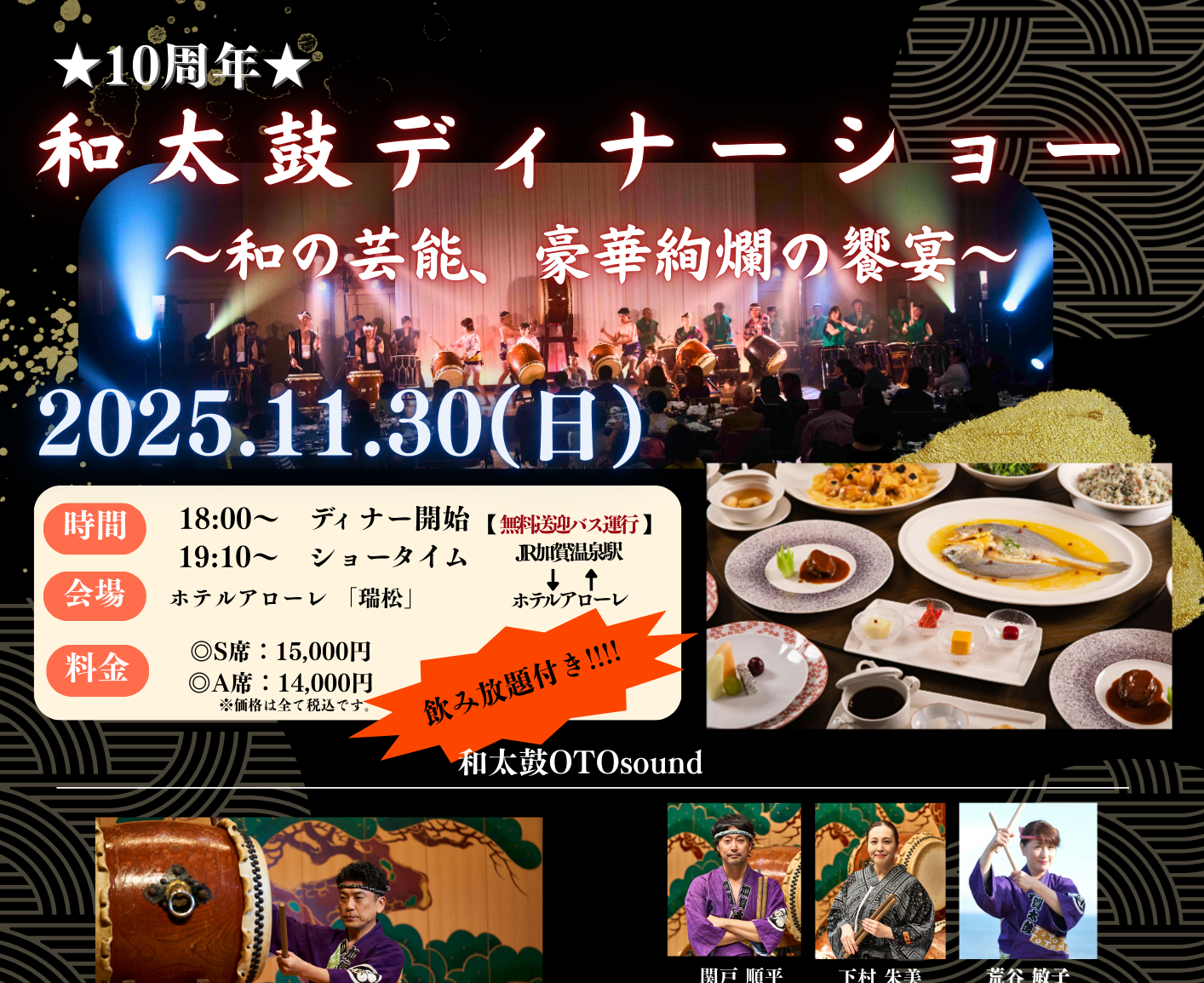 この度、2019年の開催以来、多くのお客様より再演のご要望をいただいておりました「和太鼓ディナーショー」を、6年ぶりに開催する運びとなりました。