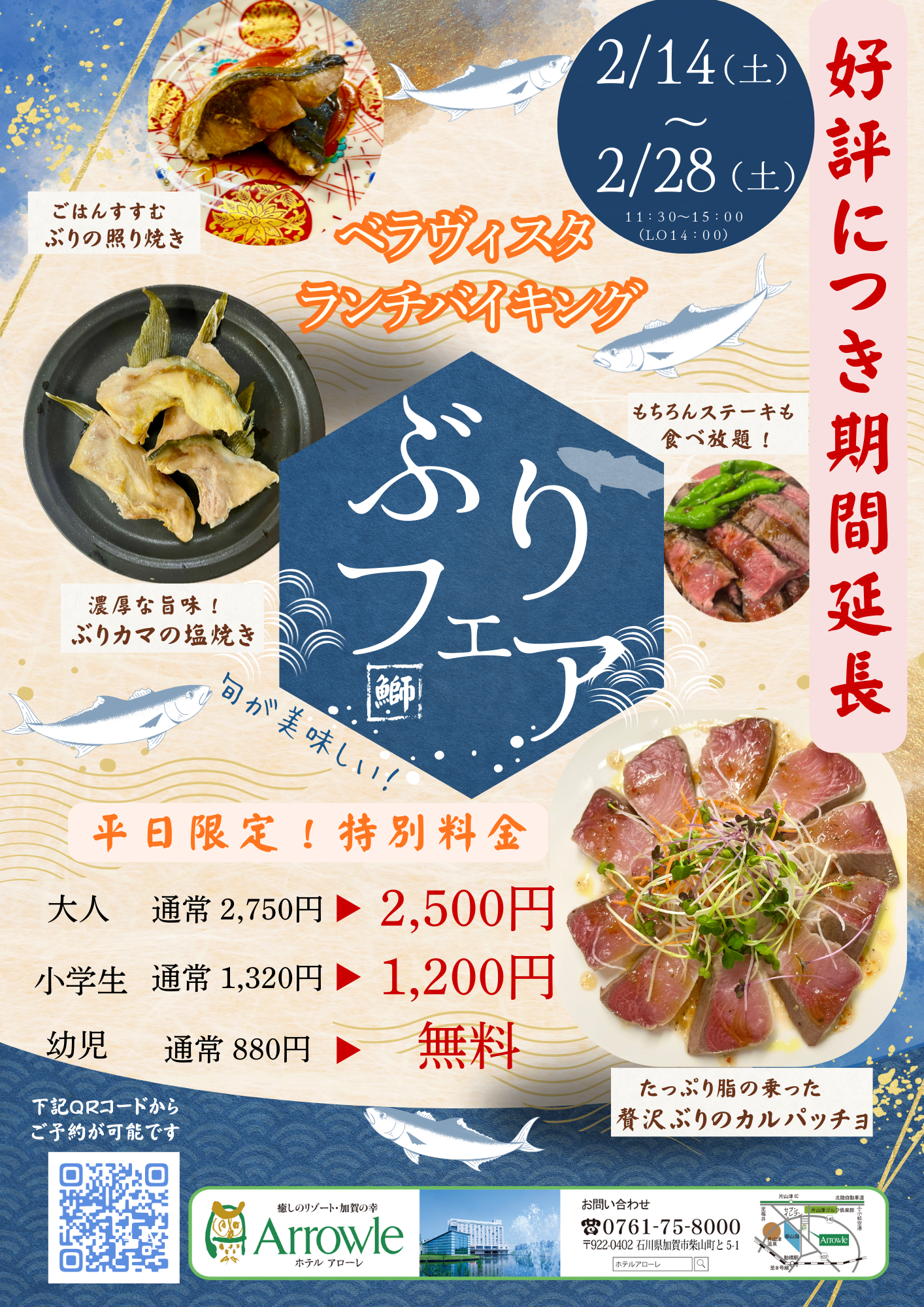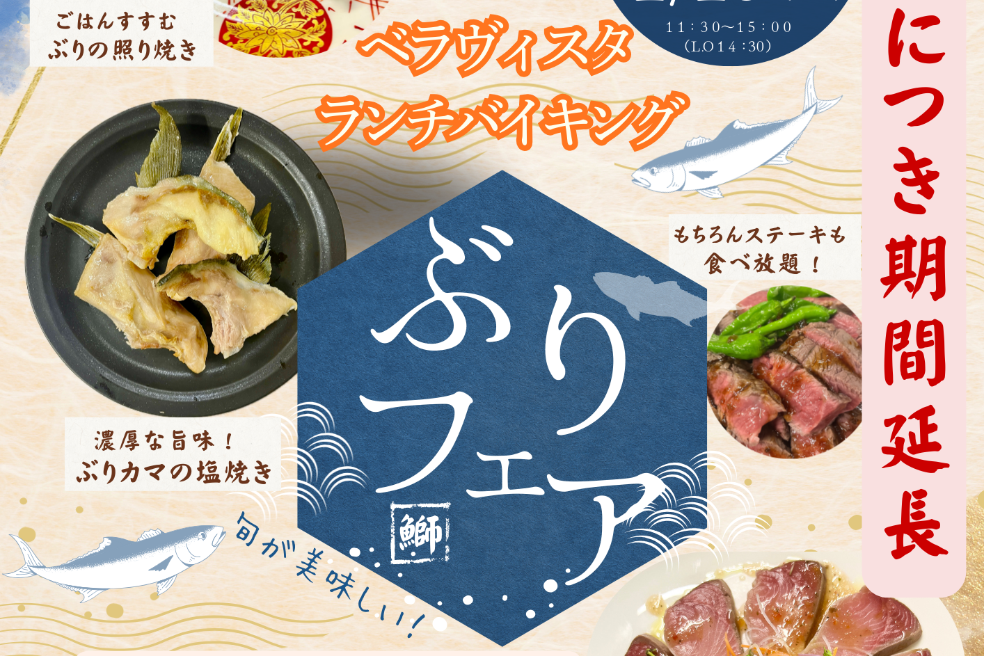 大好評いただいているテラスレストラン「ベラヴィスタ」のランチバイキング。皆様からの熱いお声にお応えして、旬の味覚を味わう「ぶりフェア」の期間延長が決定いたしました!