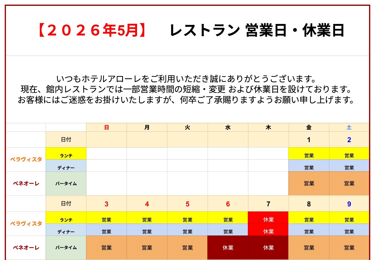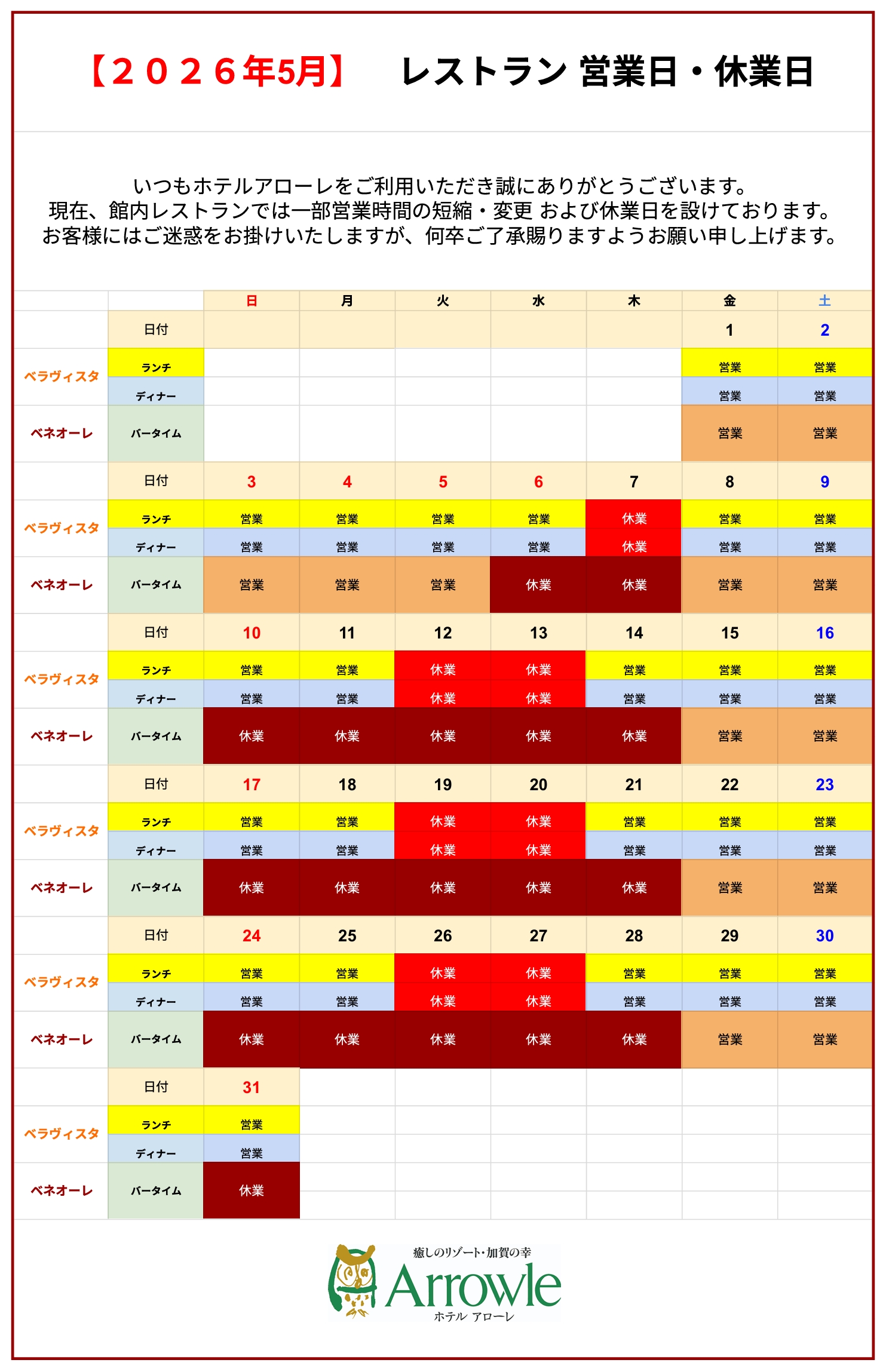 いつもホテルアローレをご愛顧いただき、心より感謝申し上げます。現在、館内レストランにおきまして、一部営業時間の変更および休業日を設けさせていただいております。