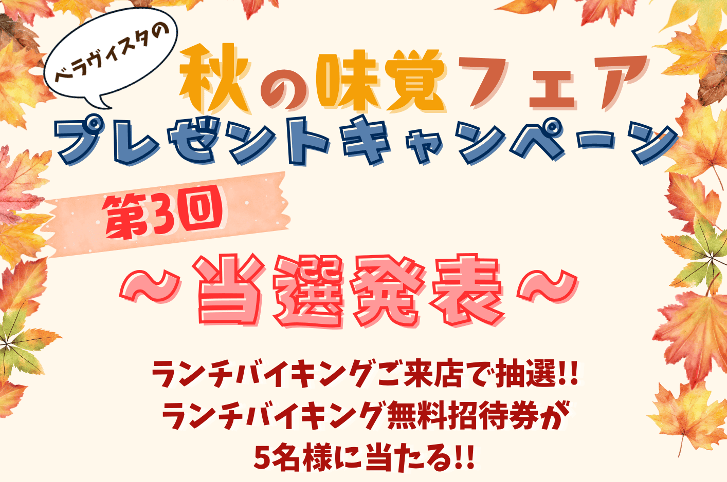この度は、「10月企画ランチバイキング」にご応募いただき、誠にありがとうございました。予想を大幅に上回る多数のご利用をいただき、スタッフ一同、心より感謝申し上げます。