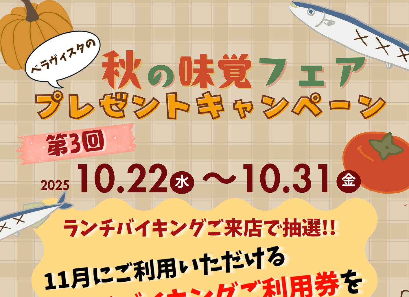 この度は、「10月企画ランチバイキング」にご応募いただき、誠にありがとうございました。予想を大幅に上回る多数のご利用をいただき、スタッフ一同、心より感謝申し上げます。