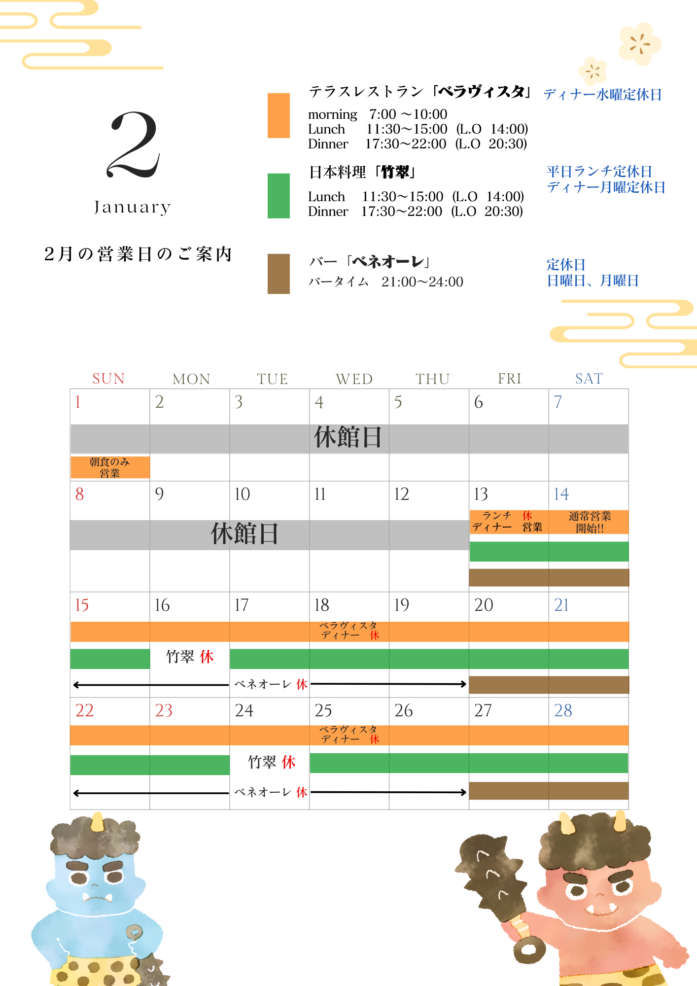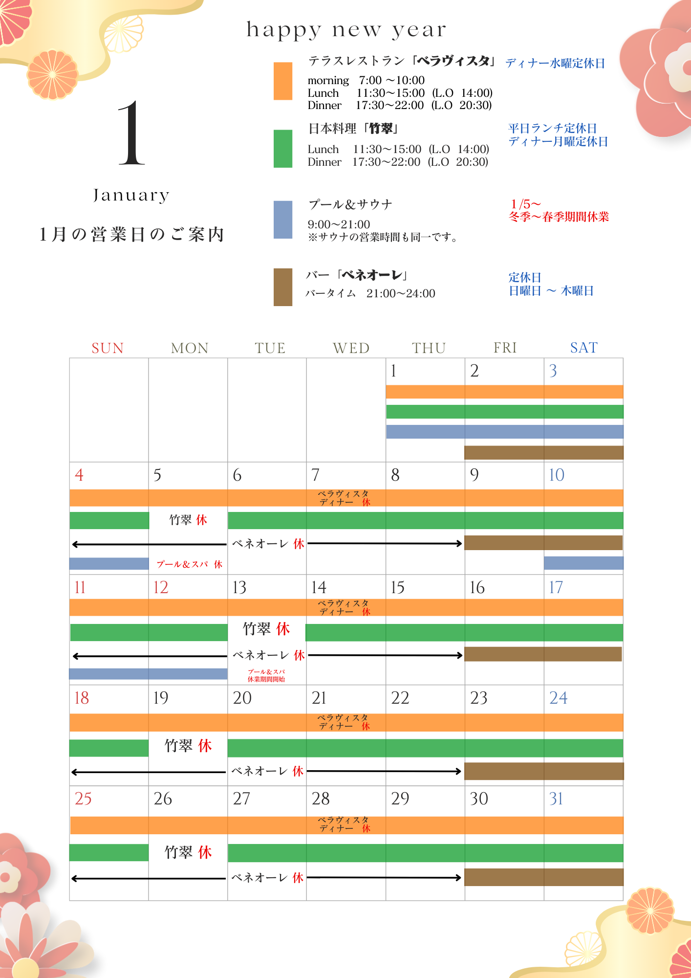 【2026年1月/2月】レストラン・プール施設営業日のご案内