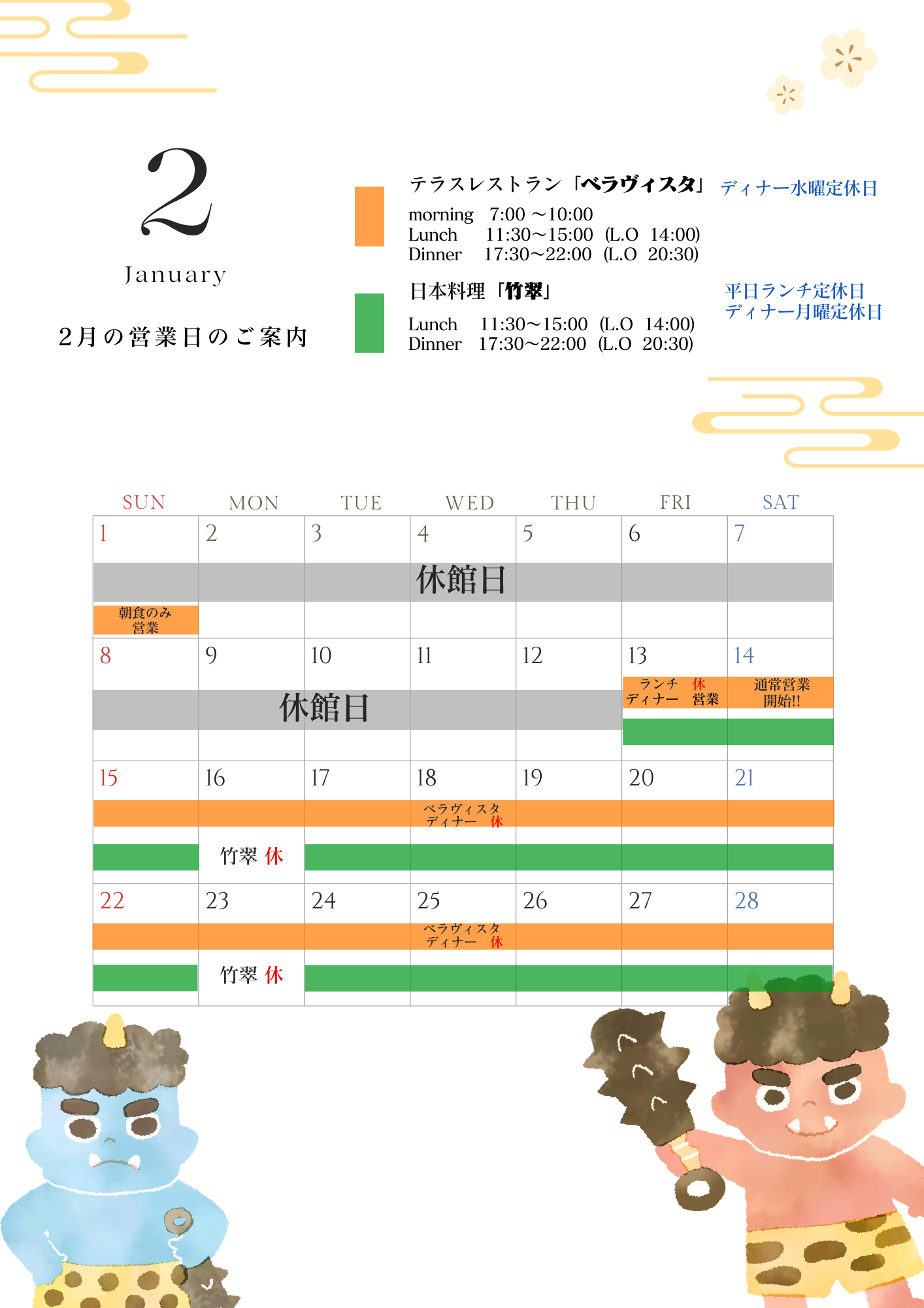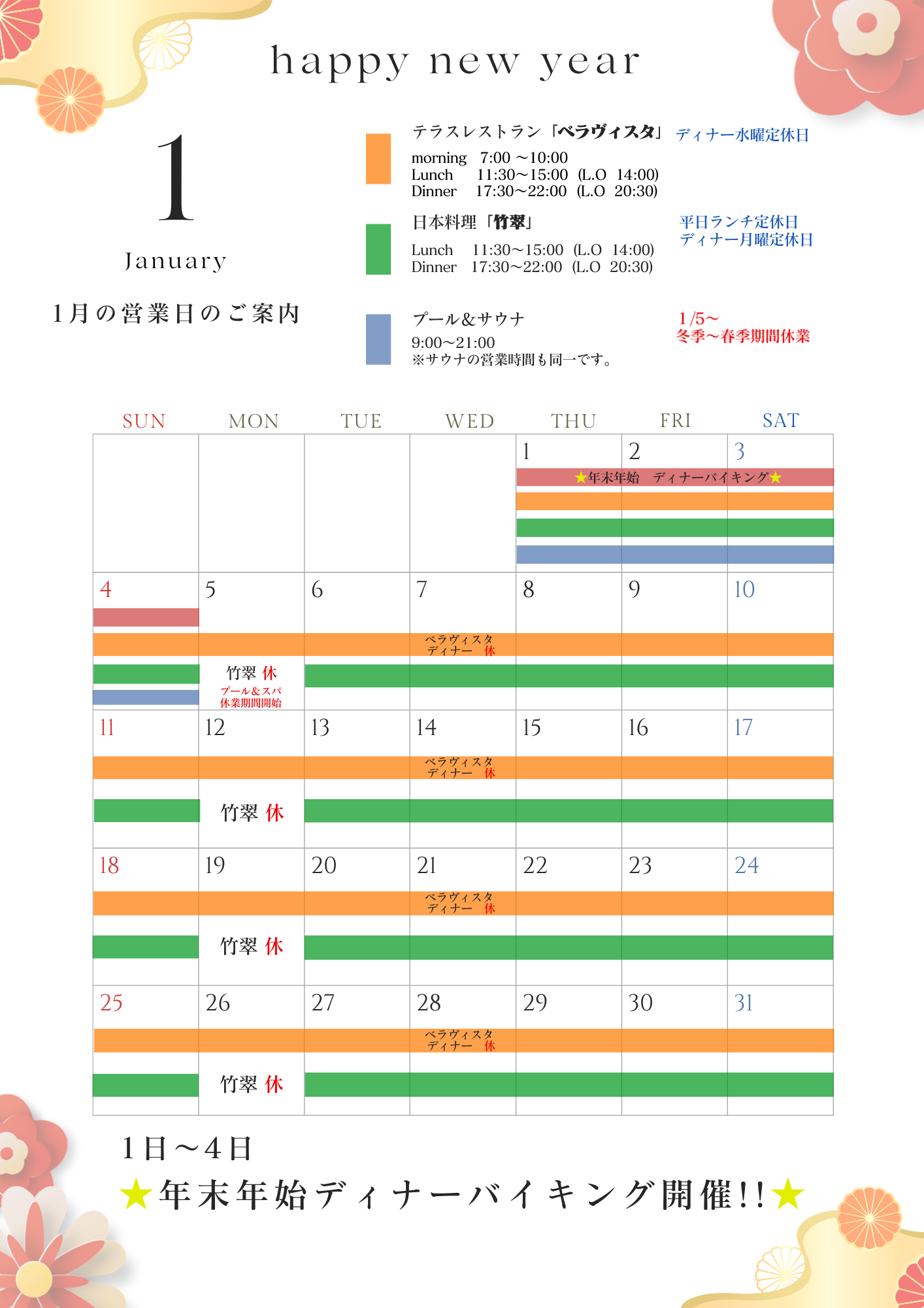 【2026年1月/2月】レストラン・プール施設営業日のご案内 new