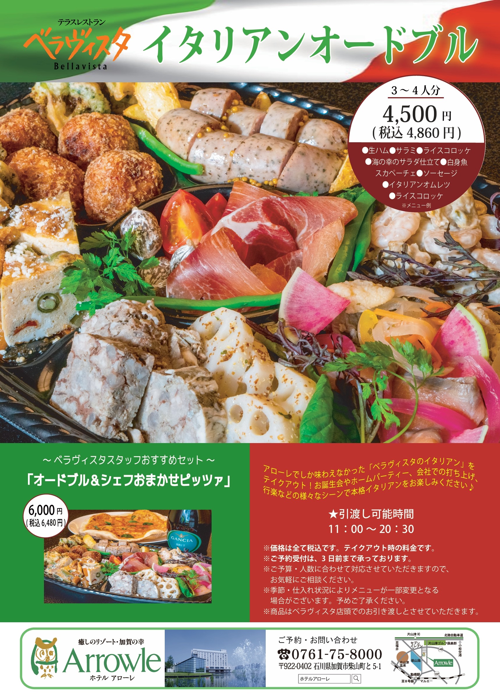 テラスレストラン「ベラヴィスタ」ランチタイムには空間全面に陽光が射し込み、ディナータイムにはライトアップされた柴山潟の灯火が濃紺の闇夜にきらめく。地産地消、地元の食材がふんだんに用いられるここでしか食べられない料理をご堪能いただけます。